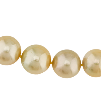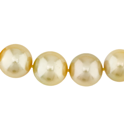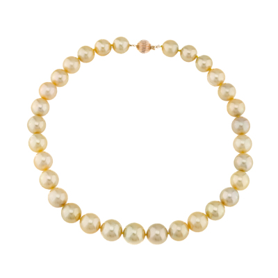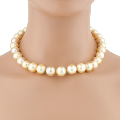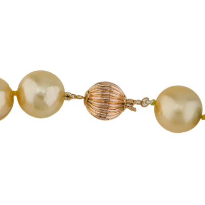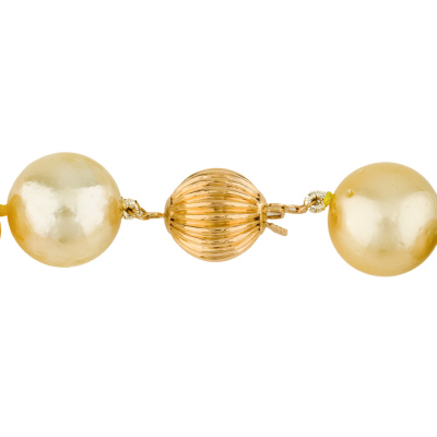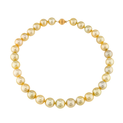 Pearl strand necklace with 34 Golden South Sea Pearls from 14.6mm - 12.0mm. 14ct yellow gold 9.8mm ball clasp. Length: 43.5cm. Weigt: 99.5g.