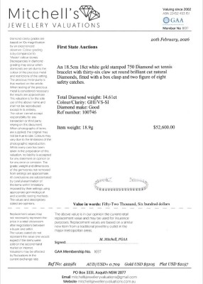Diamond tennis bracelet with 36 round natural Diamonds totalling 14.61ct (Estimated grading: GHI VS-SI). 18ct white gold. Length: 18.5cm With Valuation Certificate #422581.
