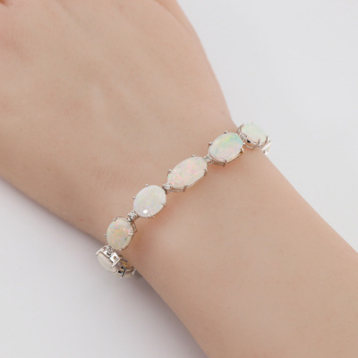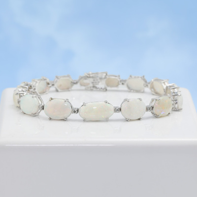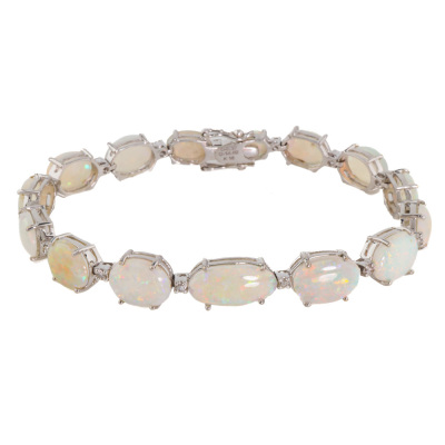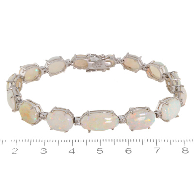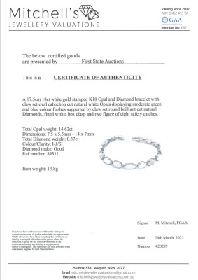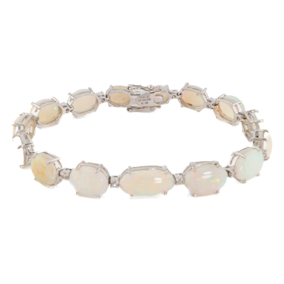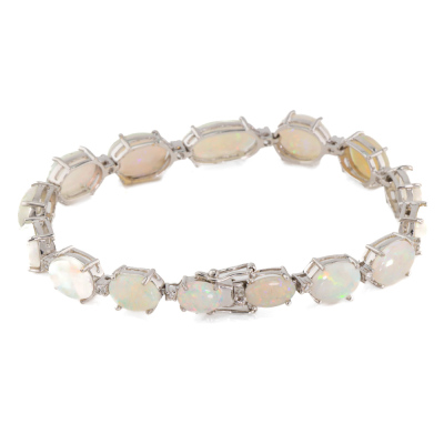 Opal and Diamond bracelet with oval cabochon cut solid Natural White Opal totalling 14.62ct and round Natural Diamonds totalling 0.37ct (Estimated grading: I-J SI). 18ct white gold. Length: 17.5cm. Weight: 13.8g. With Certificate #420289. (Pre-owned)