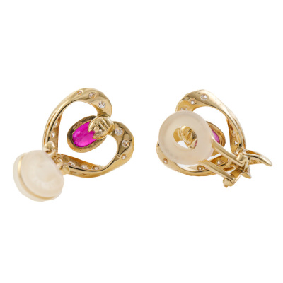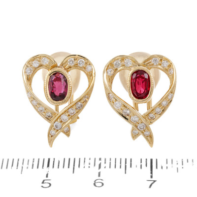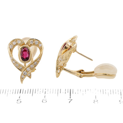 Hear design clip-on earrings (for pierced ears) with oval shape Natural Ruby totalling 1.46ct and round Diamonds totalling 0.51ct (Estimated grading: H-I VS-SI). 18ct yellow gold.