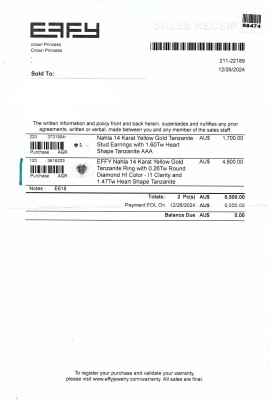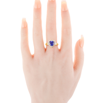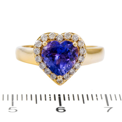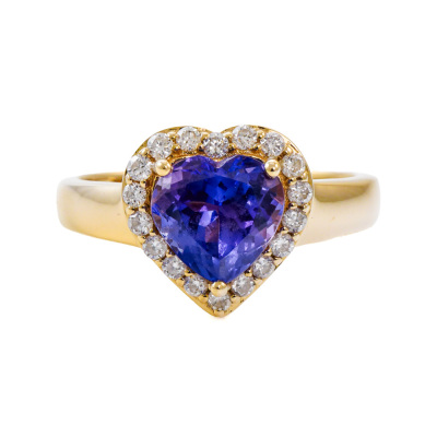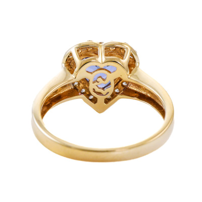 Tanzanite and Diamond ring with heart shape Natural Tanzanite of 1.47ct and round Natural Diamonds totalling 0.26ct. 14ct yellow gold. Ring size: N1/4. band width: 2.2mm - 3.4mm. Weight: 3.8g. With EFFY Invoice dated 28/12/2024. (Pre-owned)