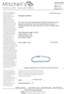 Diamond tennis bracelet with 36 round Natural Diamonds totalling 14.83ct (Estimated grading: I-J SI). 18ct white gold. Length 18cm. Weight: 18.5g. With Valuation Certificate #420059. (New)