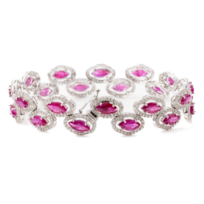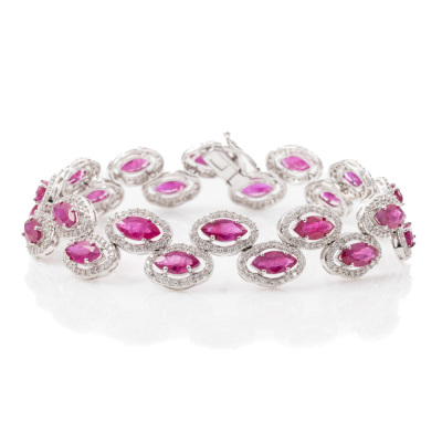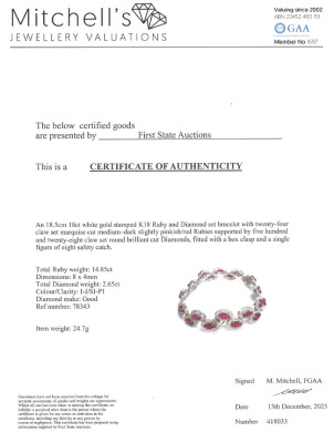 Ruby and Diamond bracelet with marquise cut Natural Rubies totalling 14.85ct and round Natural Diamonds totalling 2.65ct (Estimated grading: I-J SI-P1). 18ct white gold. Length: 18.5cm. Weight: 24.7g. With Certificate #418033. (Pre-owned)