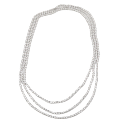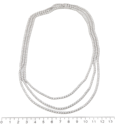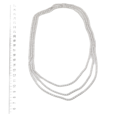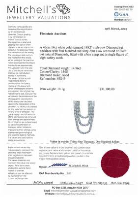 Diamond 3 row tennis necklace with 464 round Natural Diamonds totalling 14.96ct (Estimated grading: I-J SI). 14ct white gold. Length: 42cm. Weight: 18.1g. With Valuation Certificate #420136. (New)