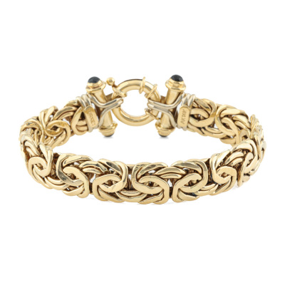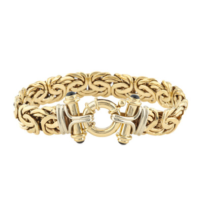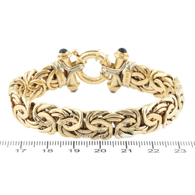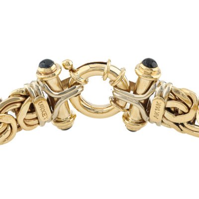 Fancy link chain bracelet set with four round cabochon cut Natural dark blue Spinels, each measuring approximately 4.3 mm in diameter, positioned at the end. 14ct yellow gold. Length: 19.5cm. Width: 1.2cm. Weight: 25.3g. (Pre-owned)