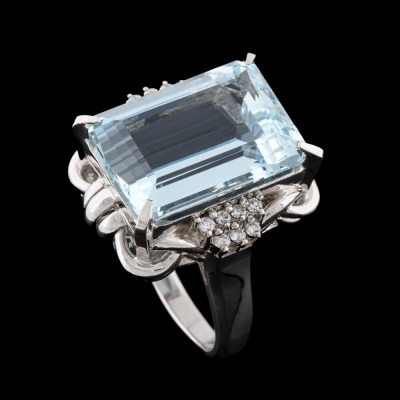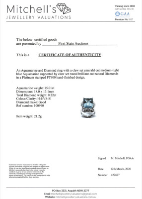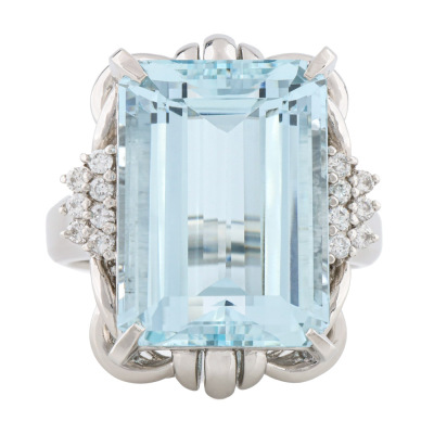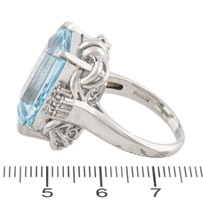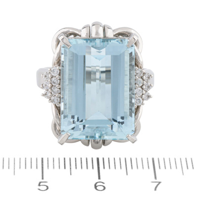 Aquamarine and Diamond ring with emerald cut Natural Aquamarine of 15.01ct and round Natural Diamonds totalling 0.22ct. Platinum-900. Ring size R3/4. Band width: 2.7mm - 4.5mm. Weight: 21.2g. With Certificate #422697.
