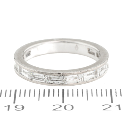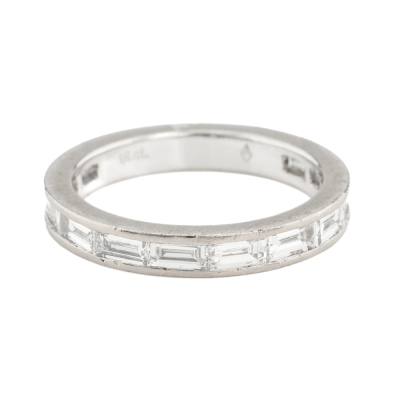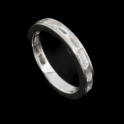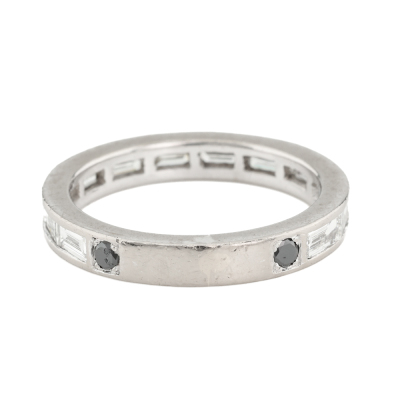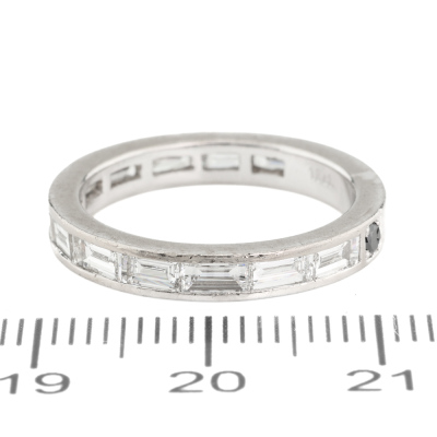 Three quarter Diamond eternity ring with 12 Baguette cut White Diamonds & 2 round Black Natural Diamonds totalling approximately 1.50ct (Estimated grading for white Diamond: H VS. Note - Black Diamonds maybe treated). 18ct white gold. Ring size: M - Ring resizing is not recommended. Band width: 3.1mm. Weight: 4.1g. (Pre-owned)