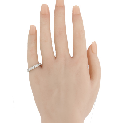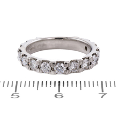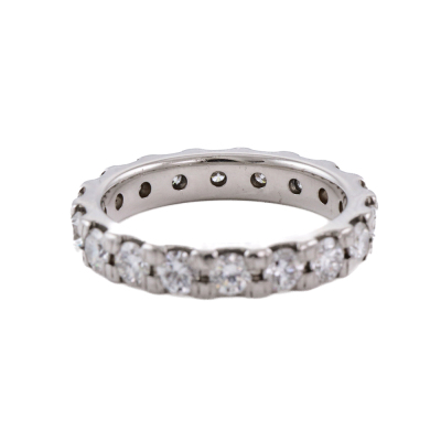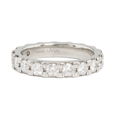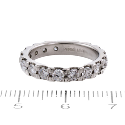 Diamond full eternity ring with 18 round Natural Diamonds totalling 1.50ct (Estimated grading: G VS). Platinum - 900. Ring size J1/2 - ring resizing is not recommended. Band width: 3.5mm. Weight: 5.7g. (Pre-owned)