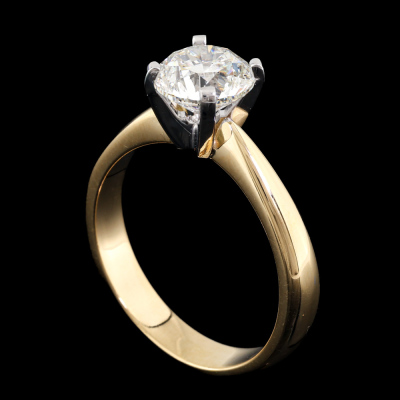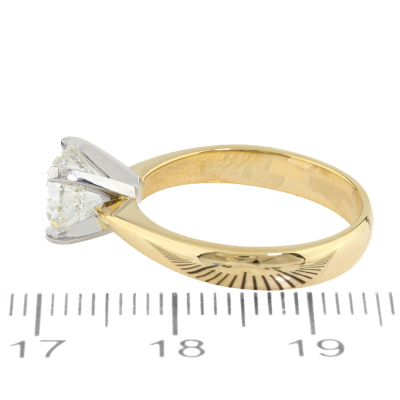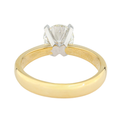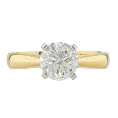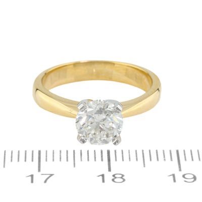 Diamond solitaire ring with a round brilliant cut Natural Diamond of 1.50ct (with GIA Report graded as I SI1 # 6522838704). 18ct yellow gold and platinum. Ring size L1/2. Band width 3.5mm - 2.8mm. Weight: 4.8g (New)