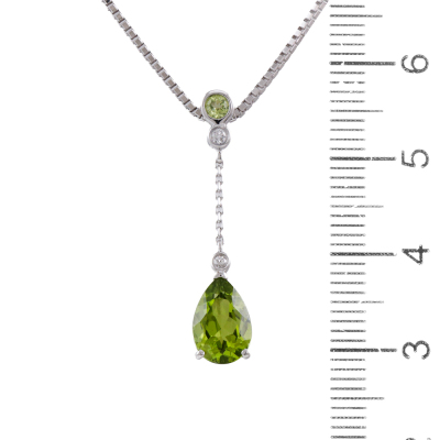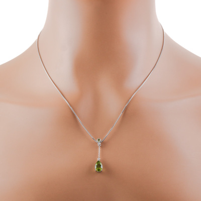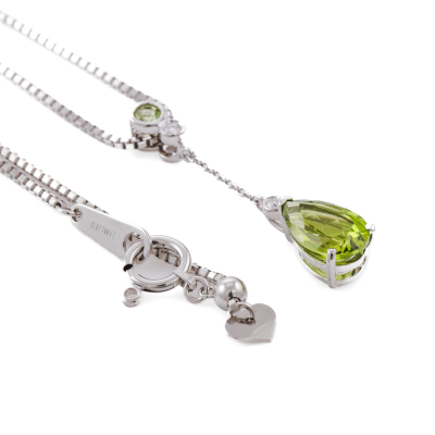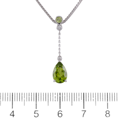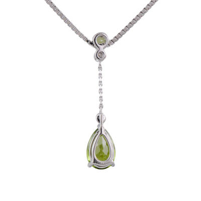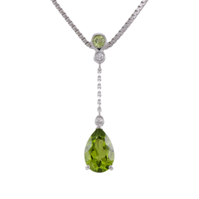 Peridot & Diamond pendant with round & pear shape Natural Peridot totalling 1.50ct and 2 round Natural Diamonds totalling 0.02ct. 18ct white gold with 45cm 18ct white gold adjustable chain. Weight: 4.6g.