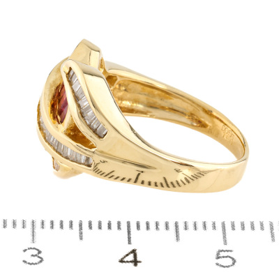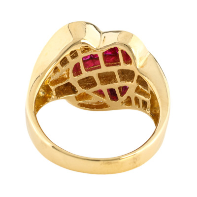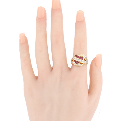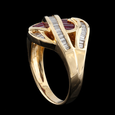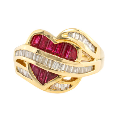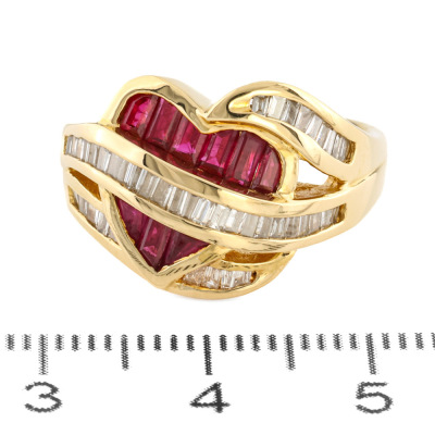 Heart design ring with baguette cut Natural Rubies totalling 1.50ct and baguette cut Natural Diamonds totalling 0.55ct (Estimated grading: G-H SI). 18ct yellow gold. Ring size M1/2. Band width: 2.8mm - 4.5mm. Weight: 9.3g. (Pre-owned)