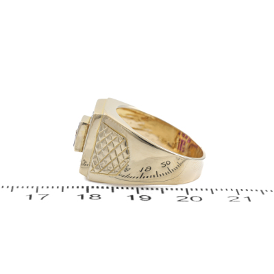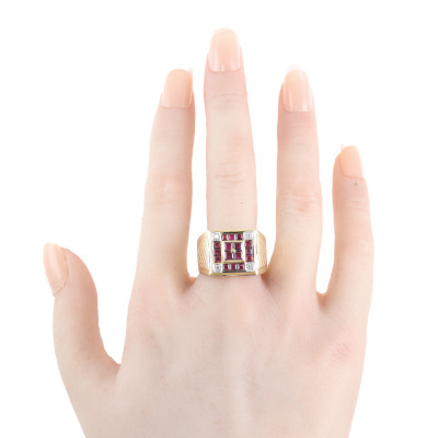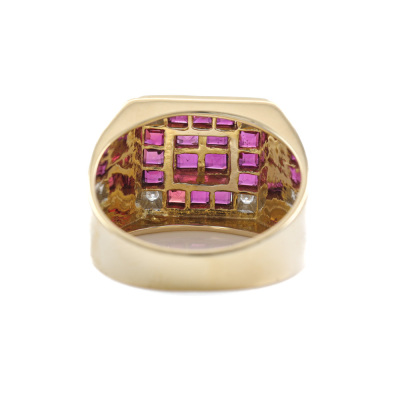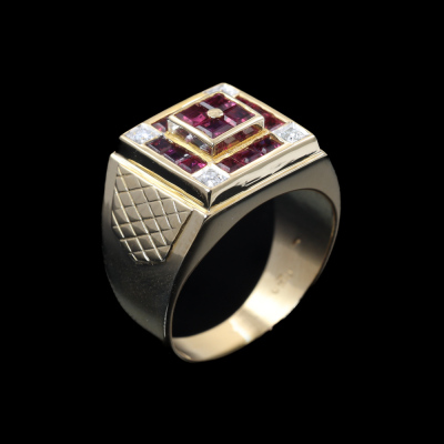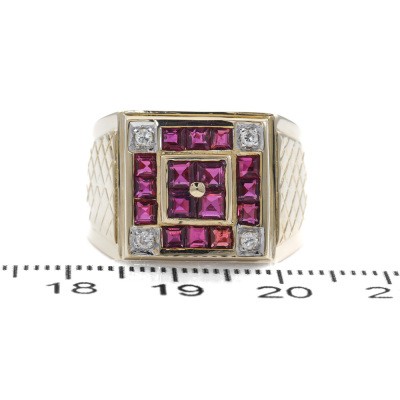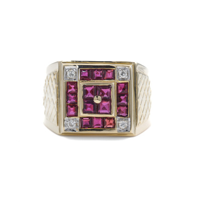 Ruby and Diamond Mens ring with carre cut Natural Rubies totalling approximately 1.50ct and round Natural Diamonds totalling approximately 0.08ct. 18ct yellow gold. Ring size: T 1/4. Band width: 4.5mm - 8mm. Weight: 13.4g. (Pre-owned)