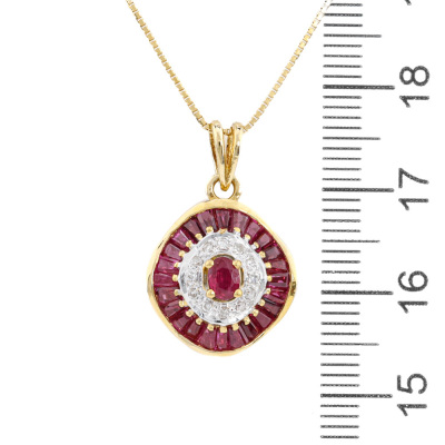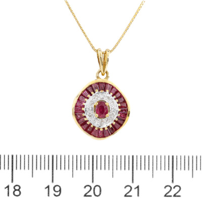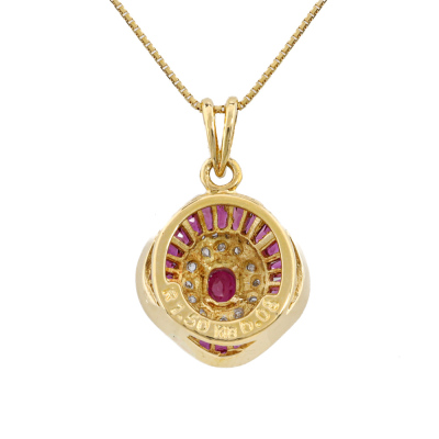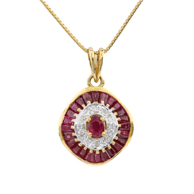 Ruby and Diamond pendant with oval & baguette cut Natural Rubies totalling 1.50ct and round Natural Diamonds totalling 0.08ct. 18ct yellow gold with 18ct yellow gold wigh 40cm 18ct yellow gold chain. Weight: 5.2g. (Pre-owned)