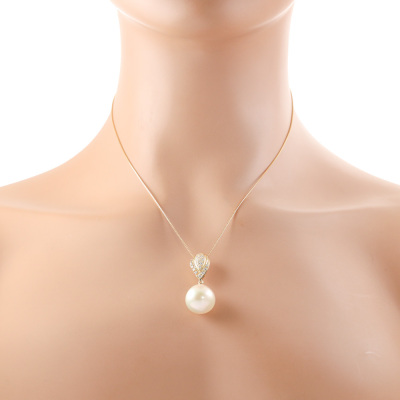 Pearl and Diamond pendant with drop shape South Sea Pearl of 15.0mm and round Natural Diamonds totalling 0.21ct. 18ct yellow gold with 45cm 18ct yellow gold adjustable chain. Weight: 8.4g. (Pre-owned)