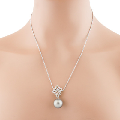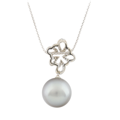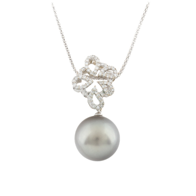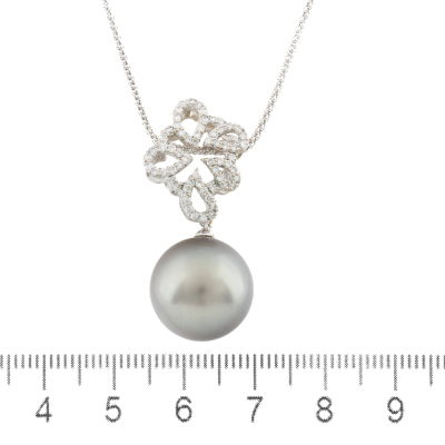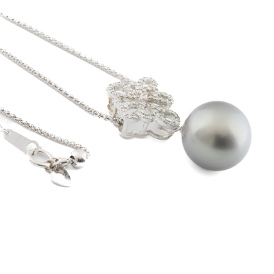 Pearl and Diamond pendant with Tahitian Pearl approximately of 15.0mm and round Natural Diamonds totalling 0.41ct (Estimated grading: H-I SI). 18ct white gold and 18ct white gold approximately 50cm adjustable chain. Weight: 10.7g. (Pre-owned)
