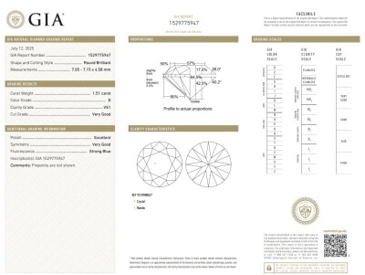 Diamond solitaire ring with round brilliant Natural Diamond of 1.51ct (with GIA report graded as D VS1 #1529775947). Platinum - 950. Ring size M. Band width 3.6mm - 3.0mm. Weight : 6.4g (New)