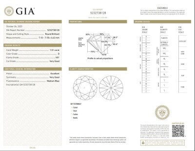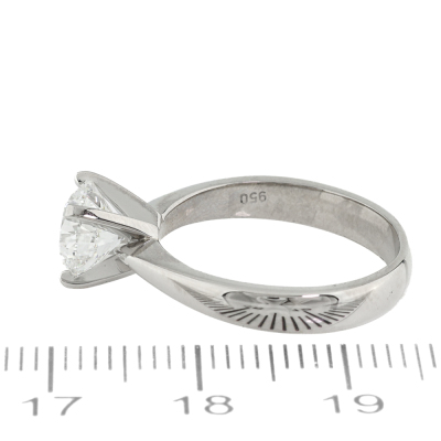 Diamond solitaire ring with a round brilliant cut Natural Diamond of 1.51ct (with GIA Report graded as D VS1 # 5232738128). Platinum - 950. Ring size M. Band width 3.4mm 2.5mm. Weight: 6.1g (New)