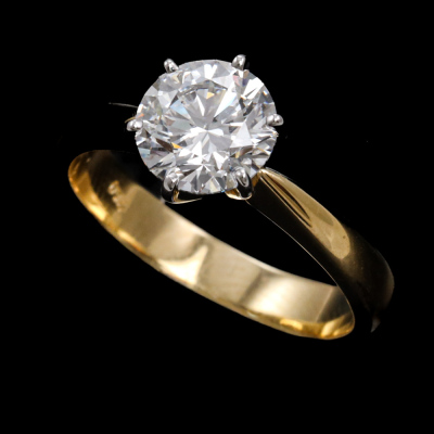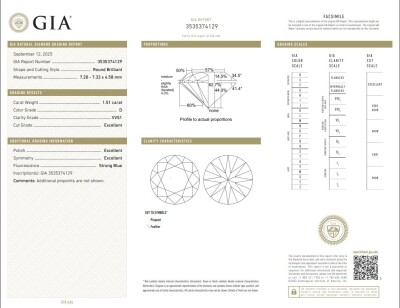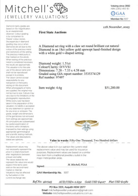Diamond solitaire ring with round brilliant cut Natural Diamond of 1.51ct (with GIA Report graded as D VVS1 #3535374129). 18ct white and yellow gold. Ring size: M1/2. Band width: 3.3mm - 2.8mm. Weight: 4.6g. With Certificate #421945. (New)
