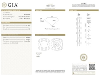 A loose cushion cut Natural Diamond of 1.51ct (With GIA Report graded as D VS2 #7528413633). (New)