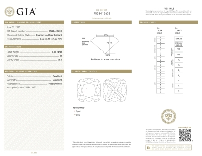 A loose cushion cut Natural Diamond of 1.51ct (With GIA Report graded as D VS2 #7528413633).
