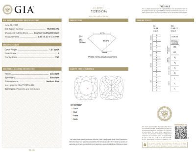 A loose cushion cut natural Diamond of 1.51 (with GIA report graded as E VS1 #7528534394). (New)