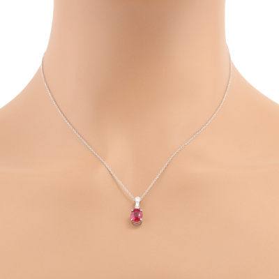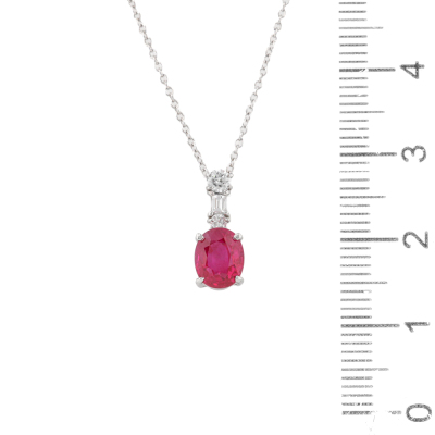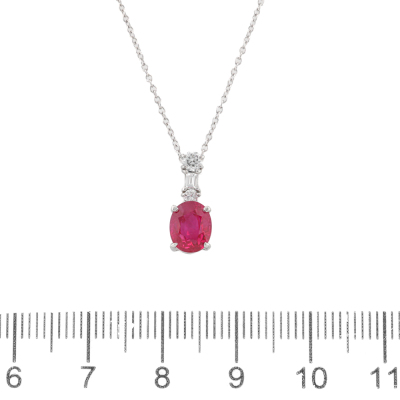 Ruby and Diamond pendant with oval shape Natural Ruby of 1.51ct and 2 round Natural Diamonds and 1 baguette cut Natural Diamond totalling 0.15ct (Estimated grading: G-H SI) Platinum - 900 with 40cm 18ct white gold 40cm chain