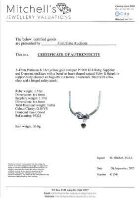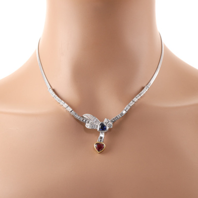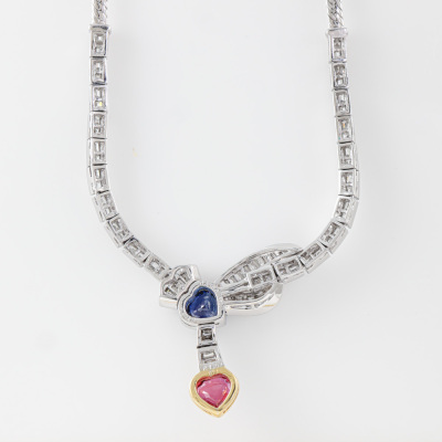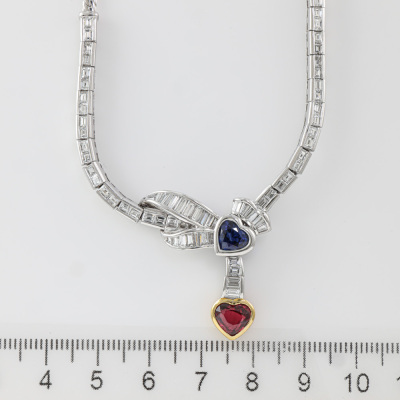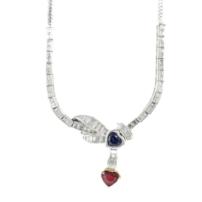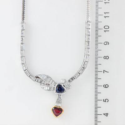 Ruby, Sapphire and Diamond necklace with a heart shape Natural Ruby of 1.51ct, heart shape Natural blue Sapphire of 1.17ct and baguette cut Natural Diamonds totalling 3.68ct (Estimated grading: G-H VS). Platinum - 900 and 18ct yellow gold with platinum - 850 attached omega chain. Length: 42cm. Weight: 30.0g. With Certificate #421506. (Pre-owned)