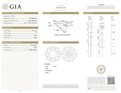 Diamond solitaire ring with round brilliant Natural Diamond of 1.51ct (with GIA report graded as F VS2 #5516044154). Platinum -950. Ring size M. Band width 3.5mm -2.8mm. Weight : 6.0h (New)