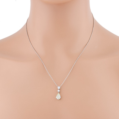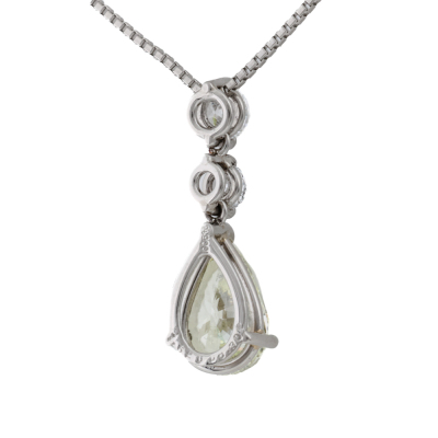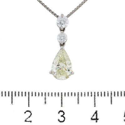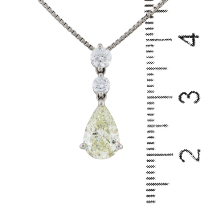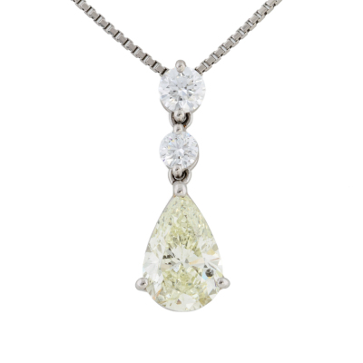 Diamond pendant with pear shape Natural Diamond of 1.52ct (Estimated grading: M-N P1-P2) and round Natural Diamonds totalling 0.30ct (Estimated grading: G SI). Platinum - 850 with 45.5cm platinum - 850 chain. Weight: 4.6g.