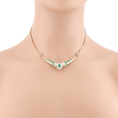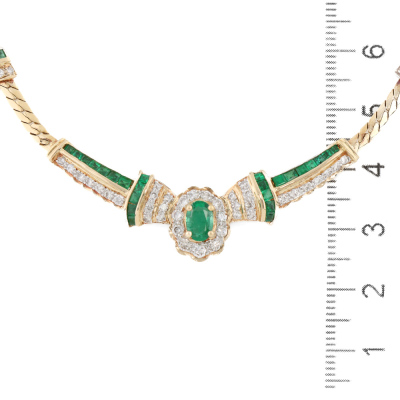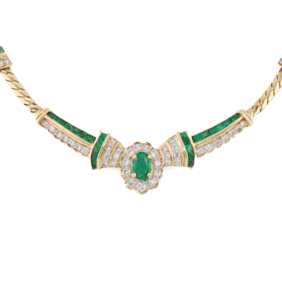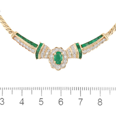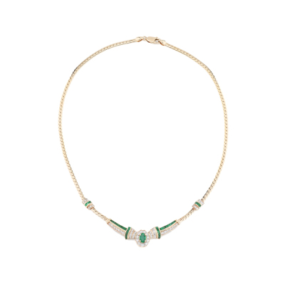 Emerald and Diamond necklace with oval natural emerald of 0.51ct & carre cut Natural emeralds of 1.01ct and round Natural Diamonds totalling 0.97ct (Estimated grading: I-J VS-SI). 18ct yellow gold with attached 18ct yellow gold chain. Inner circumference: approximately 41cm. Weight: 15.8g. With Certificate #421789. (Pre-owned)