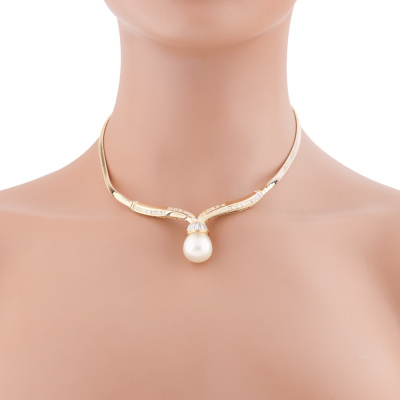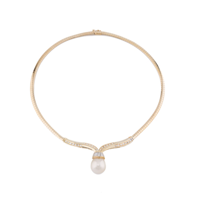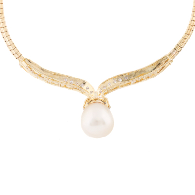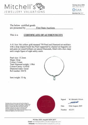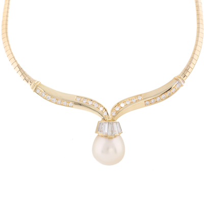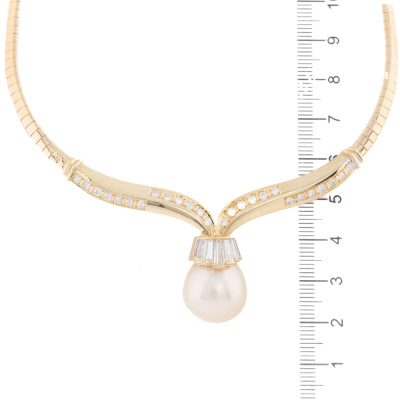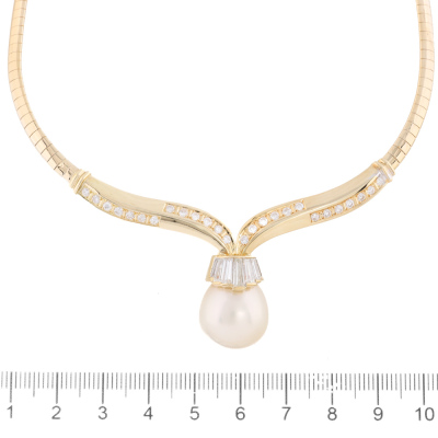 Pearl necklace with drop shape South Sea Pearl of 15.2mm and round & baguette cut Natural Diamonds totalling approximately 1.98ct (Estimated grading: G-H SI). 18ct yellow gold. Length: 41.5cm. Weight: 33.4g. With Certificate #421271. (Pre-owned)