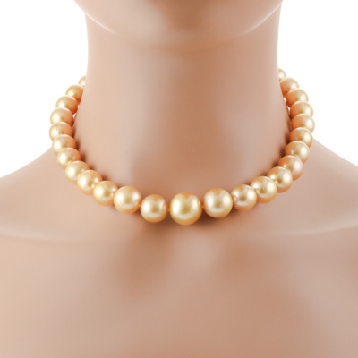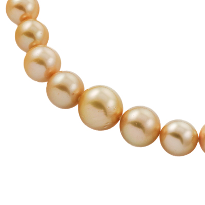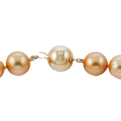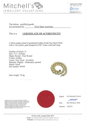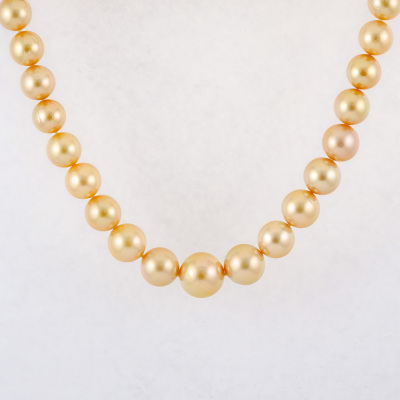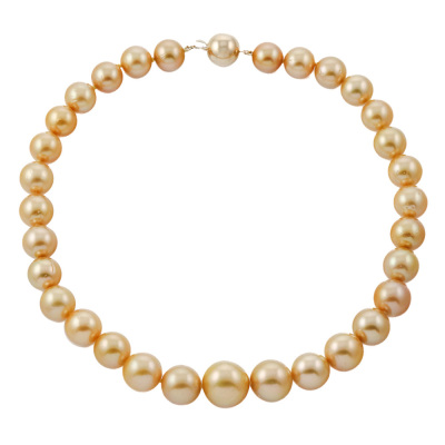 Pearl strand necklace with 31 graduated Golden South Sea Pearls from 15.3mm - 10.8mm. 14ct yellow gold 12mm ball clasp. Length: 40cm. Weight: 78.4g. With Certificate #422474.