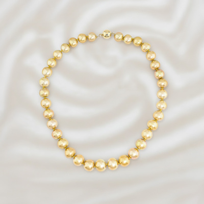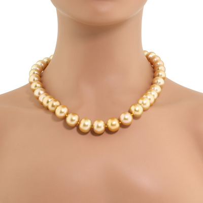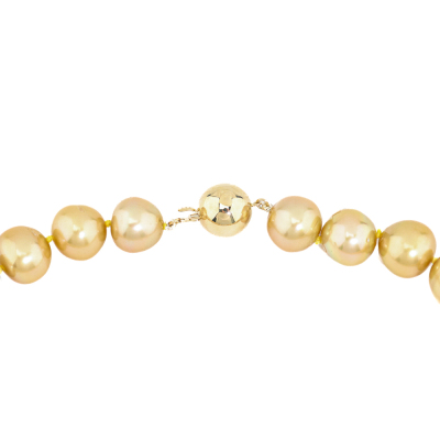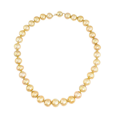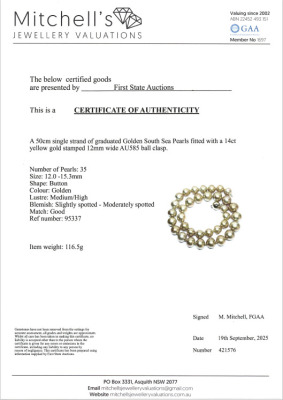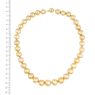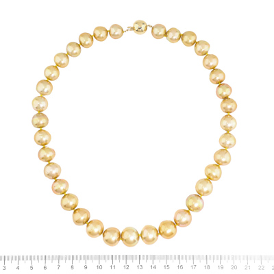 Pearl strand necklace with 35 button shape graduated Golden South Sea Pearls from 15.3mm - 12mm. 14ct yellow gold 12mm ball clasp. Length: 50cm. Weight: 116.5g. With Certificate #421576. (As New)