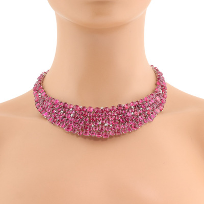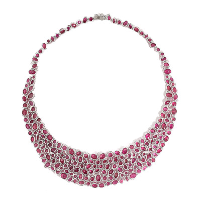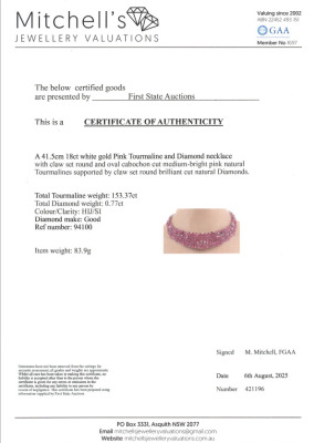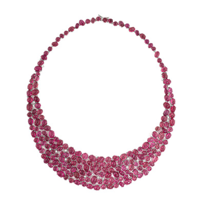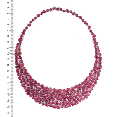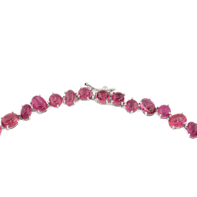 Collar necklace with round & oval cabochon cut Natural Pink Tourmaline totalling 153.37ct and round Natural Diamonds totalling 0.77ct (Estimated grading: HIJ SI). 18ct white gold. Inner circumference: 41.5cm. Weight: 83.9g. With Certificate #421196. (Pre-owned)