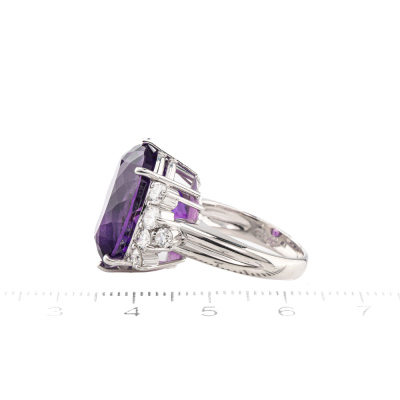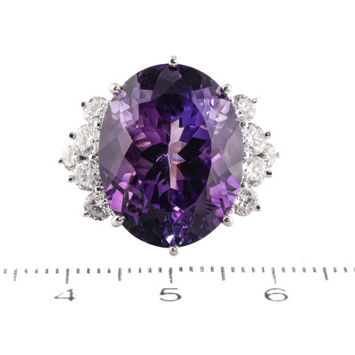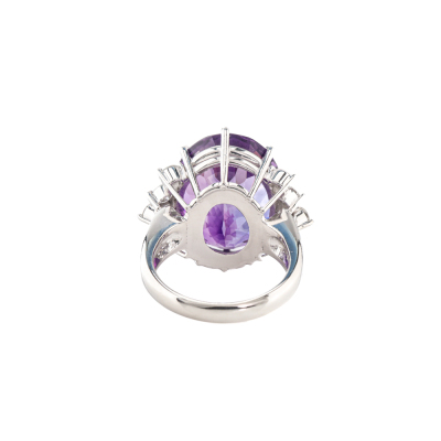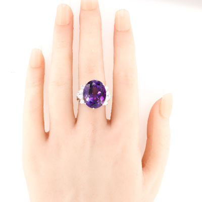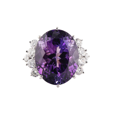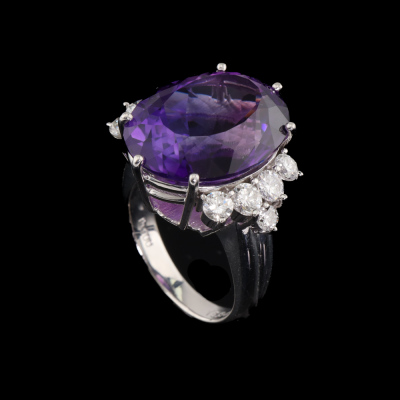 Amethyst and Diamond ring with oval shape Natural Amethyst of 15.34ct and round Natural Diamonds totalling 1.16ct (Estimated grading: H-I SI). Platinum - 900. Ring size L. Band width: 3mm - 4.3mm. Weight: 15.7g. (Pre-owned)