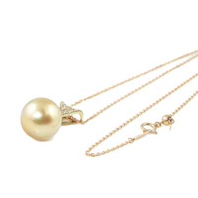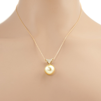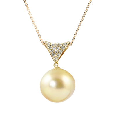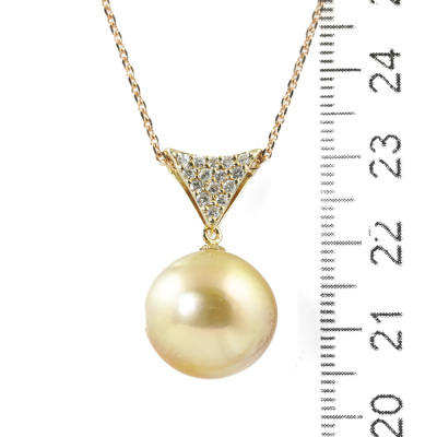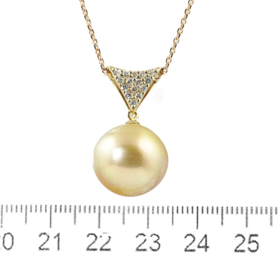 Pearl and Diamond pendant with Golden South Sea Pearl approximately of 15.3mm and round Natural Diamonds totalling 0.25ct. 18ct yellow gold with 45cm 18ct rose gold adjustable chain. Weight: 9.5g. (Pre-owned)