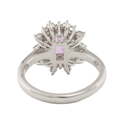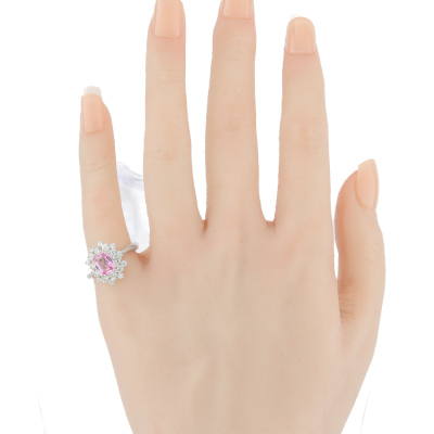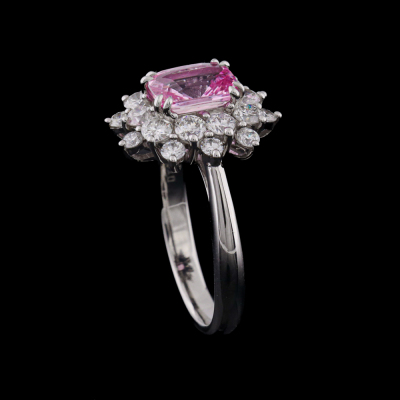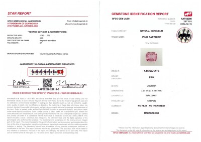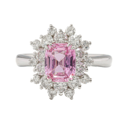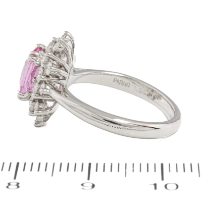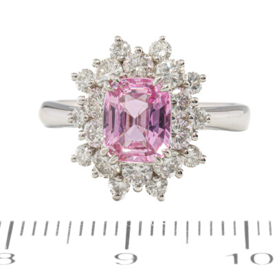 Sapphire and Diamond ring with centre cushion cut unheated Madagascan Natural Pink Sapphire of 1.56ct (with GFCO Gemstone Identification Report #AAP32298) and round Natural Diamonds totalling 1.02ct (Estimated grading: H-I VS). Platinum 950. Ring size K1/2. Band width: 2.4mm - 2.2mm. Weight: 6.7g. (Pre-owned)
