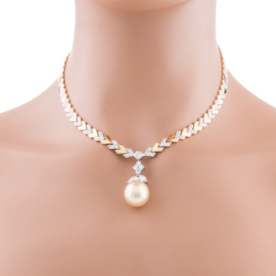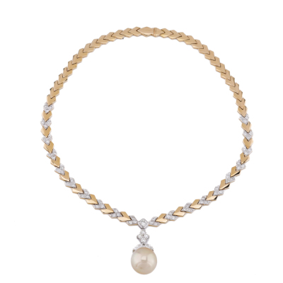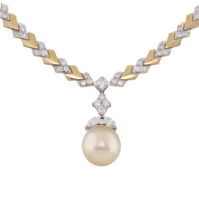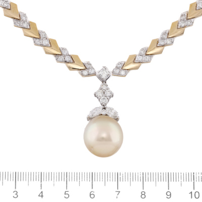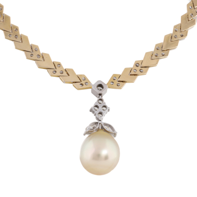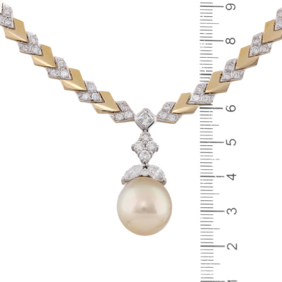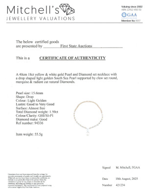 Pearl and Diamond necklace with drop shape Light Golden South Sea Pearl of 15.6mm and round, marquise & radiant cut Natural Diamonds totalling approximately 1.50ct (Estimated grading: GHI SI-P1). 18ct yellow & white gold with 18ct yellow gold attached chain. Length: 40cm. Weight: 55.5g. With Certificate #421234. (Pre-owned)