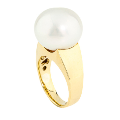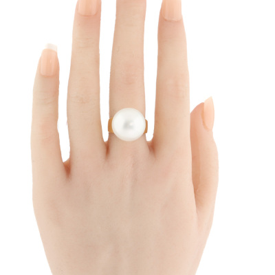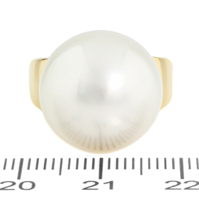 Pearl ring with button shape South Sea Pearl of 15.6mm. 18ct yellow gold. Ring size L. Band width: 3.6mm - 6.5mm. Weight: 10.5g. (Pre-owned)