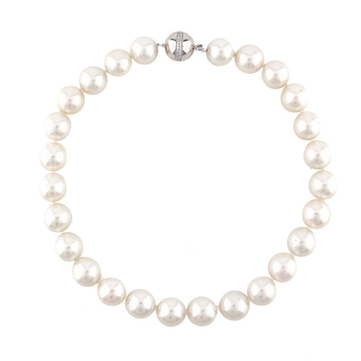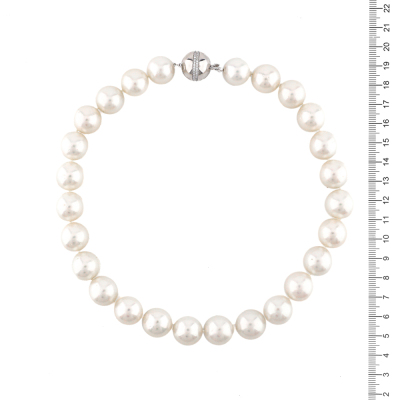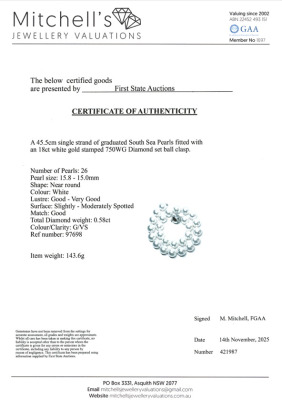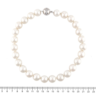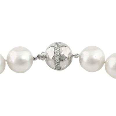 Pearl strand Necklace with 26 slight graduated South Sea Pearls from 15.8mm - 15.0mm. 18ct white gold 15.5mm ball clasp set with 0.58ct of Natural Diamonds (Estimated grading: G VS). Length: 45.5cm. Weight: 143.6g. With Certificate #421987. (As New)