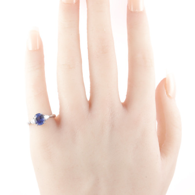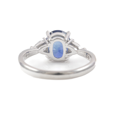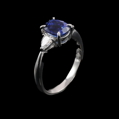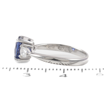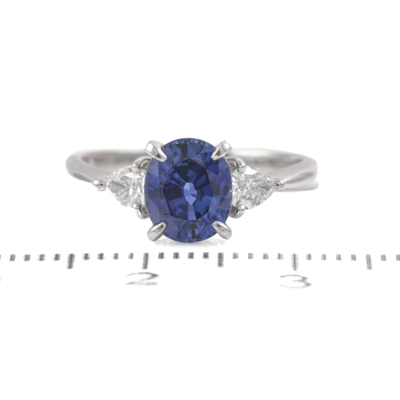 Sapphire and Diamond ring with oval shape Natural Blue Sapphire of 1.58ct and 2 pear shape Natural Diamonds totalling 0.27ct. Platinum - 900. Ring size I½. Band width: 2.1mm - 1.4mm. Weight: 3.5g. (Pre-owned)