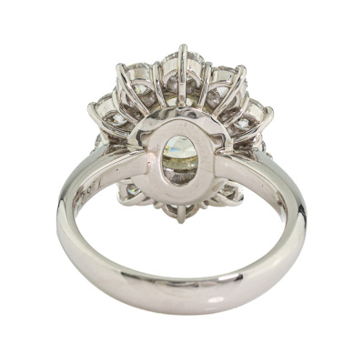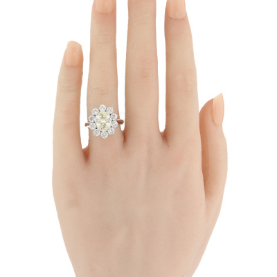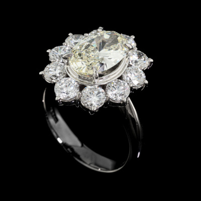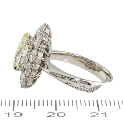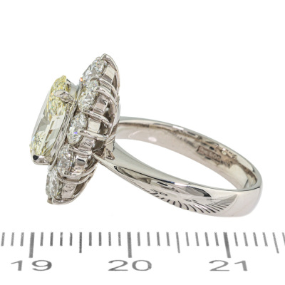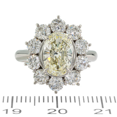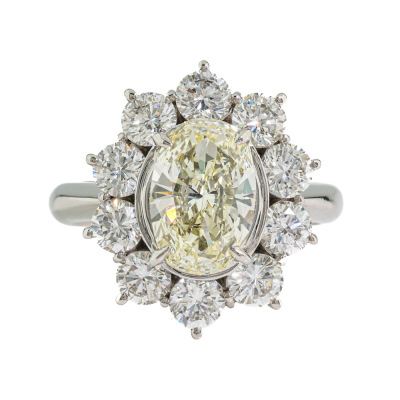 Diamond halo ring with centre oval shape Natural Yellow Diamond of 1.59ct (With GSL Report graded as Natural Light Yellow SI2) and surrounding round Natural Diamonds totalling 1.88ct (Estimated grading: G-H VS). Platinum 900. Ring size K 1/4. Band width: 3.4mm-2.3mm. Weight: 9.0g. (Pre-owned)
