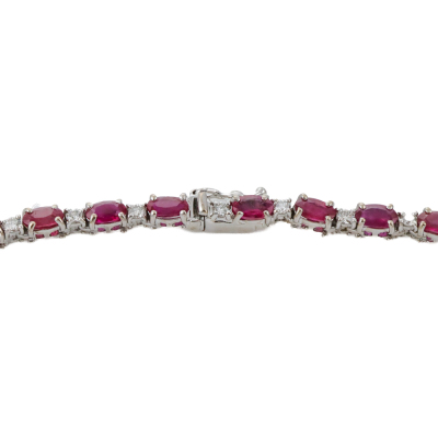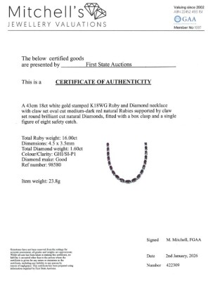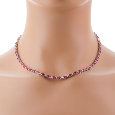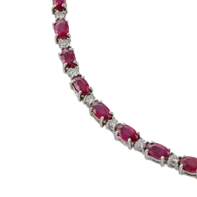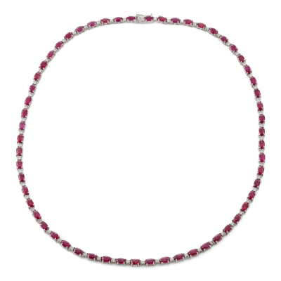 Ruby and Diamond necklace with oval shape Natural Rubies totalling 16.00ct and round Natural Diamonds totalling 1.60ct (Estimated grading: GHI SI-P1). 18ct white gold. Length: 43cm. Weight: 23.8g. With Certificate #422309. (Pre-owned)
