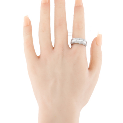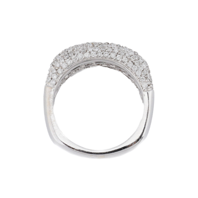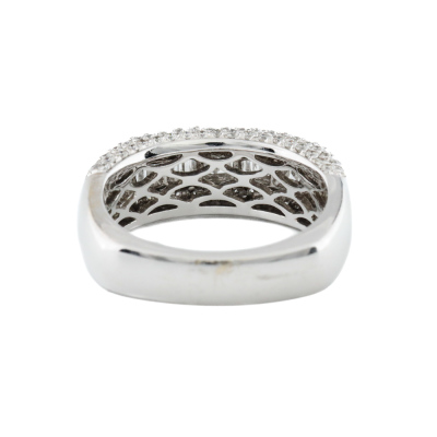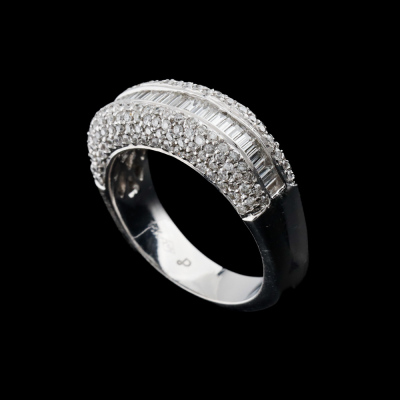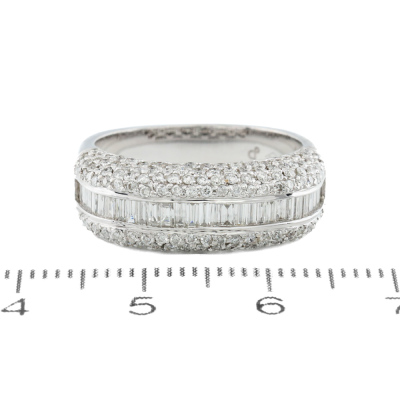 Diamond dress ring with round & baguette cut Natural Diamonds totalling approximately 1.60ct (Estimated grading: H-I SI). 18ct white gold. Ring size: M1/2. Band width: 4.3mm - 5.6mm. Weight: 8.6g. (Pre-owned)