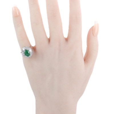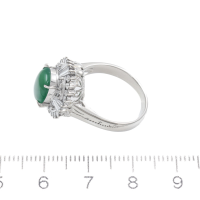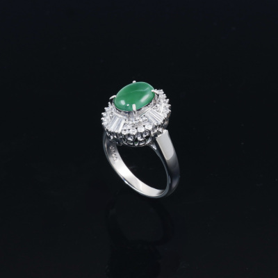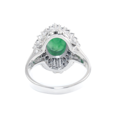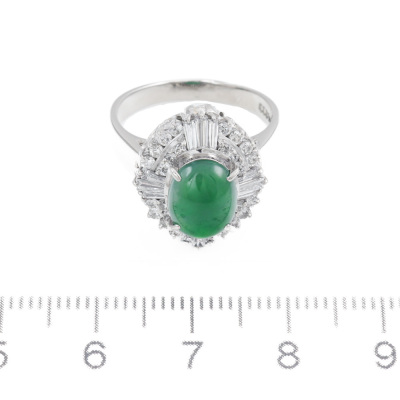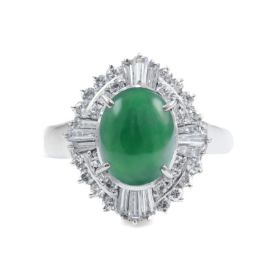 Jade and Diamond ring with oval cabochon cut Natural Jadeite Jade - Type A of approximately 1.60ct and round & baguette cut Natural Diamonds totalling 0.78ct (Estimated grading: G VS-SI). Platinum - 900. Ring size L1/2. Band width: 2.5mm - 3.5mm. Weight: 7.7g. (Pre-owned)