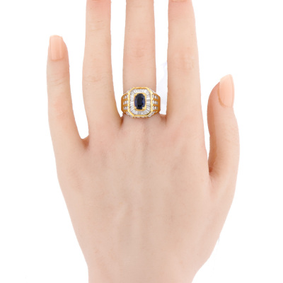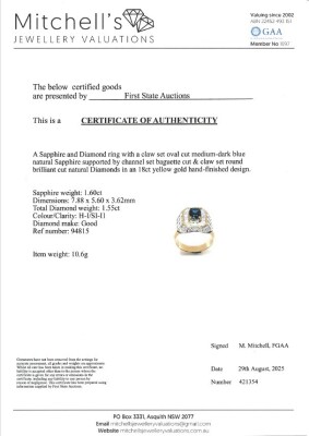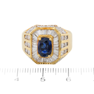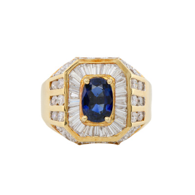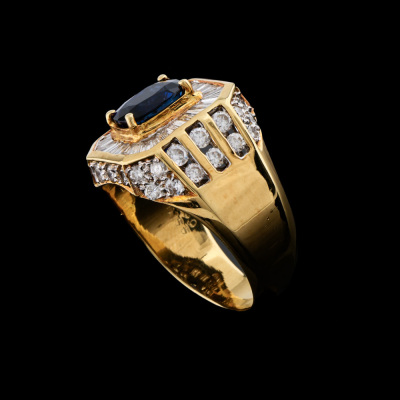 Mens ring with centre oval shape Natural deep blue Sapphire of 1.60ct and round & baguette cut Natural Diamonds totalling 1.55ct (Estimated grading: H-I SI-P1). 18ct yellow gold. Ring size O3/4. Band width: 4.6mm - 7.6mm. Weight: 10.6g. With Certificate #421354. (Pre-owned)