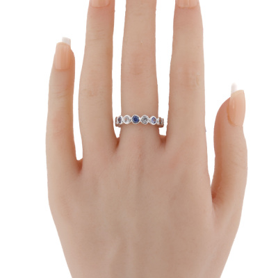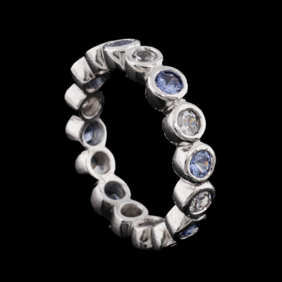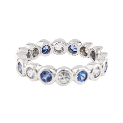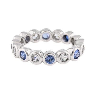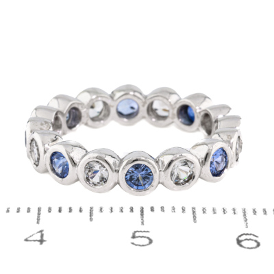 Sapphire eternity ring with round Natural blue and colourless Sapphires totalling approximately 1.60ct. 18ct white gold. Ring size N - Ring resizing is not recommended. Band width: 4.4mm. Weight: 6.1g. (Pre-owned)