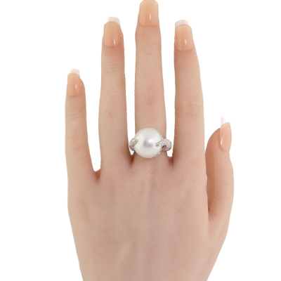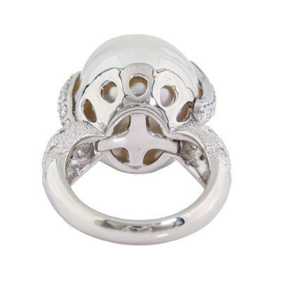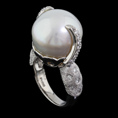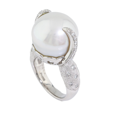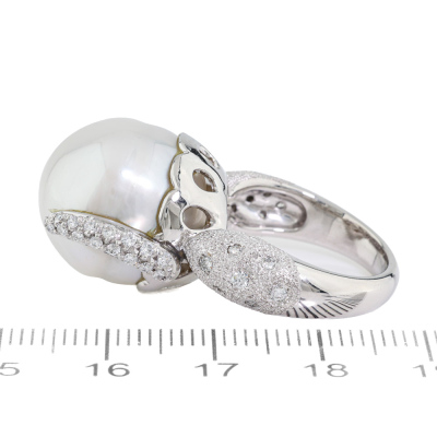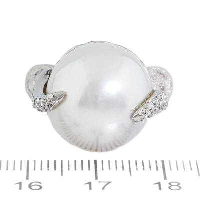 Pearl and Diamond ring with South Sea Pearl of 16.0mm and surrounding round Natural Diamonds of 0.58ct (Estimated grading: H SI). Platinum - 900. Ring size M. Band width: 3.6mm - 5.5mm. Weight: 22.6g. (Pre-owned).