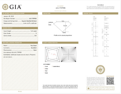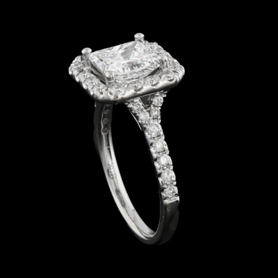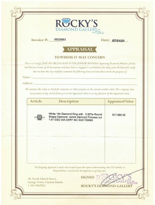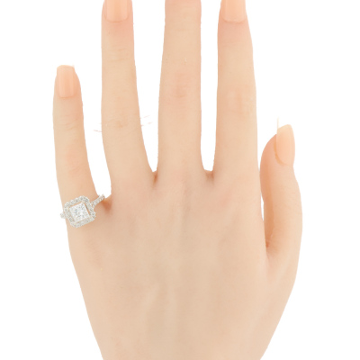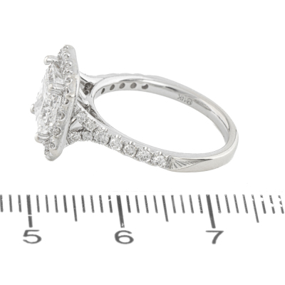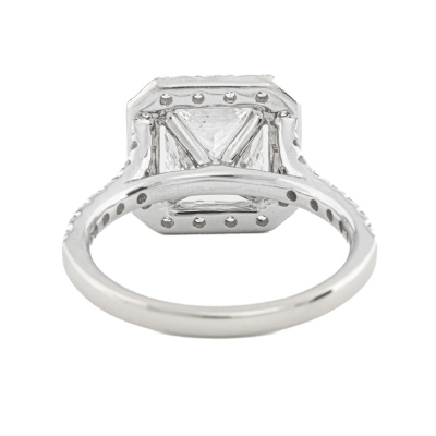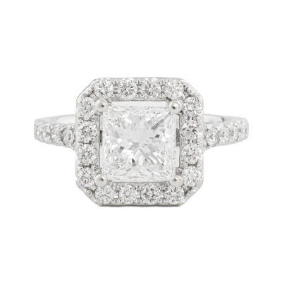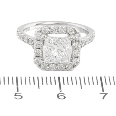 Diamond halo engagement ring with a centre princess cut Natural Diamond of 1.61ct (with GIA Report graded as E SI2 #6341759985) and rest round Natural Diamonds totalling 0.56ct (Estimated grading: G VS). 14ct white gold. Ring size J. Band width: 1.9mm. Weight: 3.6g. With copy of Valuation Certificate dated 07/31/21. (Pre-owned)