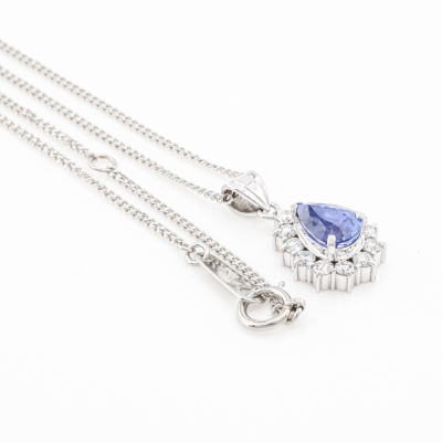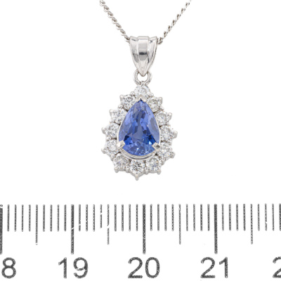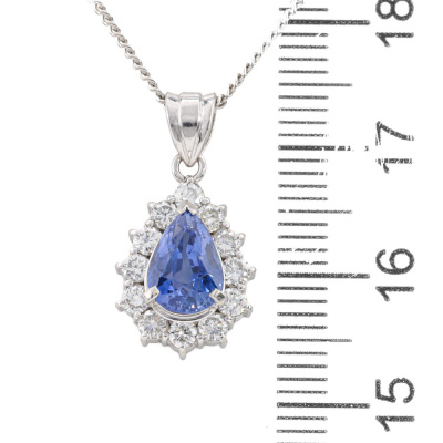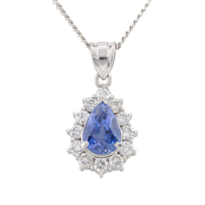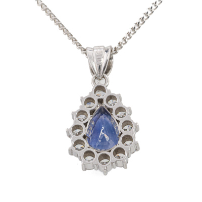 Sapphire and Diamond pendant with centre pear shape Natural Blue Sapphire of 1.62ct and round Natural Diamonds totalling 0.53ct (Estimated grading: G-H VS). Platinum - 900 with 41cm Platinum - 850 adjustable chain. Weight: 5.8g. (Pre-owned)